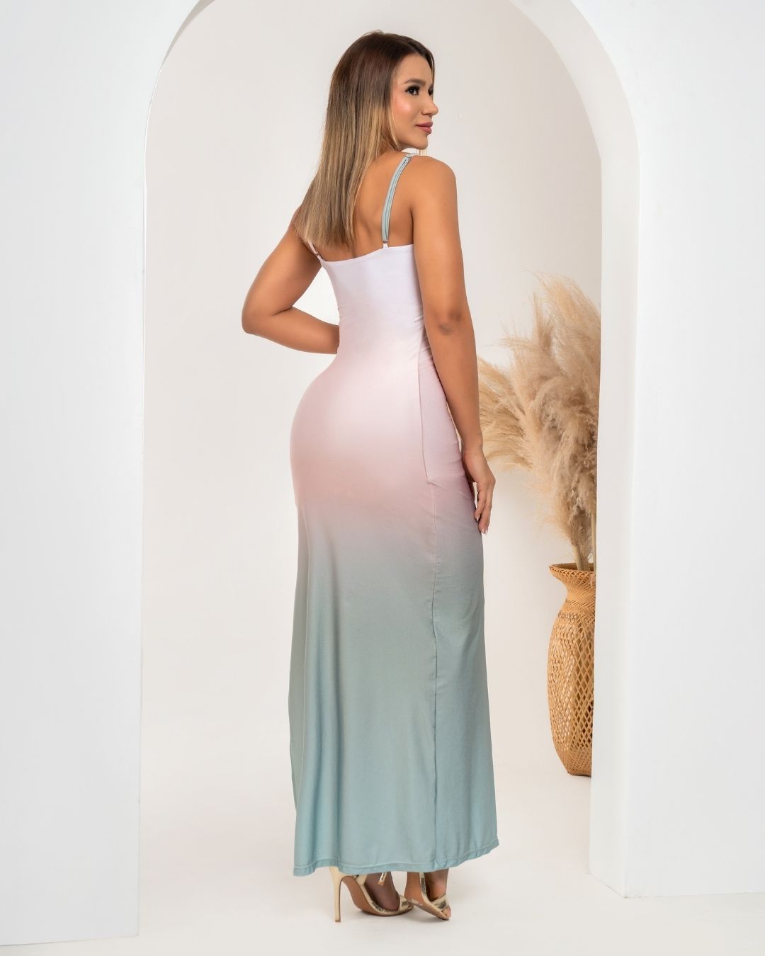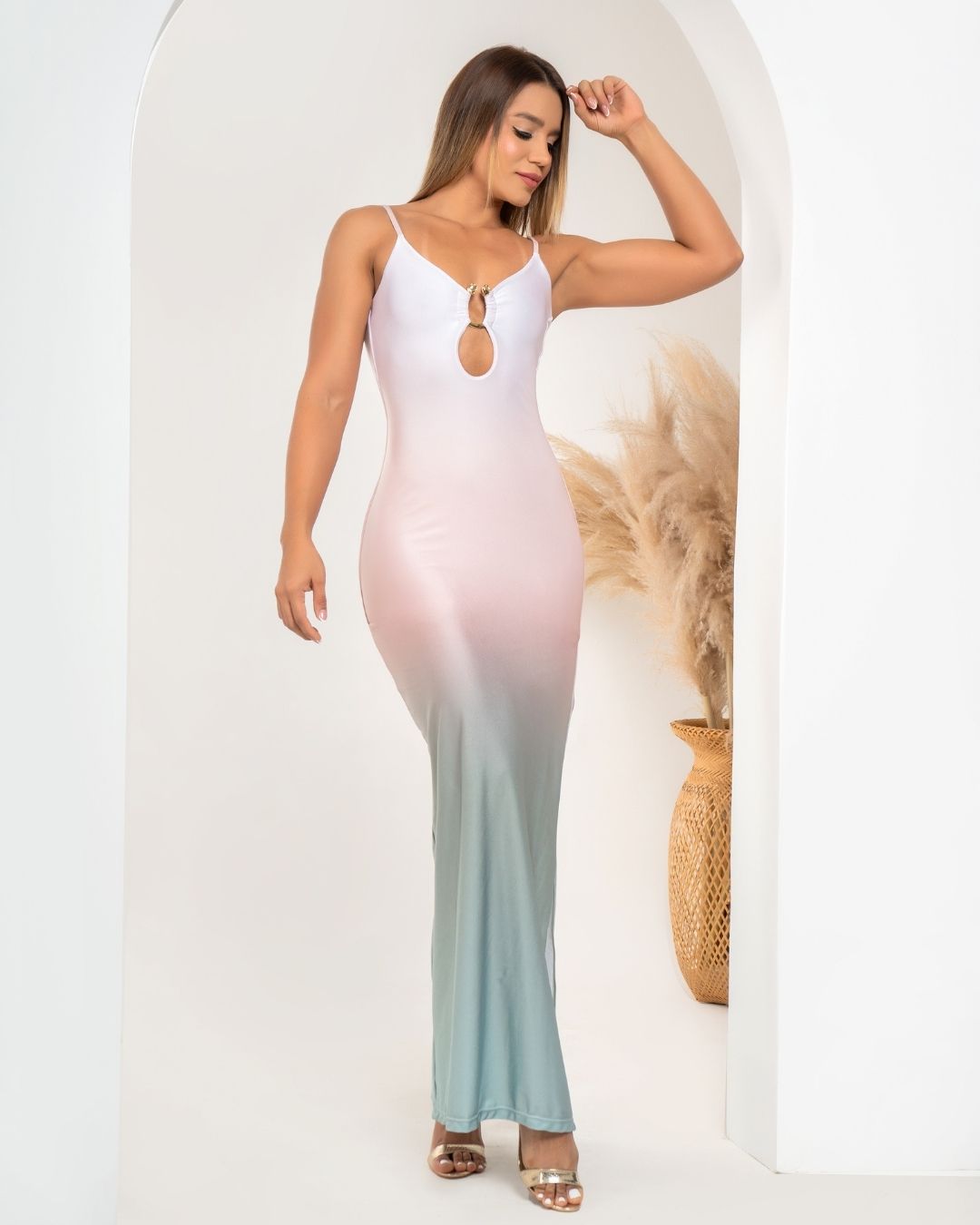 Embrace the tranquil hues of the sea with our Ocean Mist Dress. Crafted from soft, high-quality Lira fabric, this dress flows beautifully, hugging your silhouette in all the right places. The gradient color effect captures the essence of a misty ocean sunrise, creating an elegant, ethereal look. Featuring a stylish front cut-out with a delicate ring detail, this dress is perfect for both casual beachside strolls and sophisticated evening gatherings.